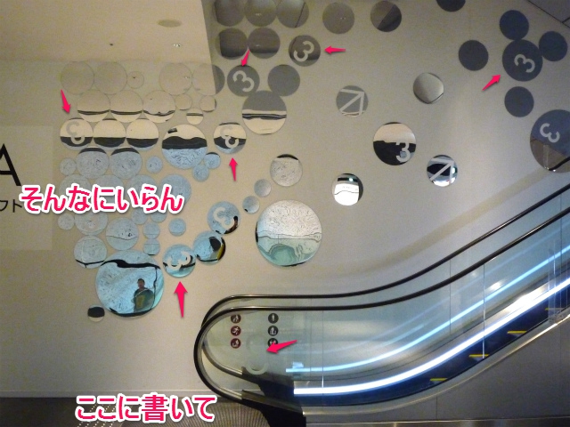 エスカレーター正面、めっちゃがんばったデザインですが、前に人がいたらわかんないって。