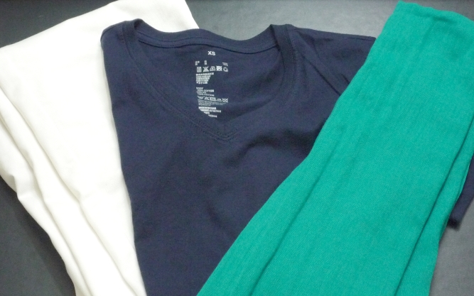 気になるけれど、合わせる色が難しいなと思って見送っていましたが、無印のダークネイビーTシャツが一軍投入となり、これに合わせてグリーンのストールを購入しましたよ。