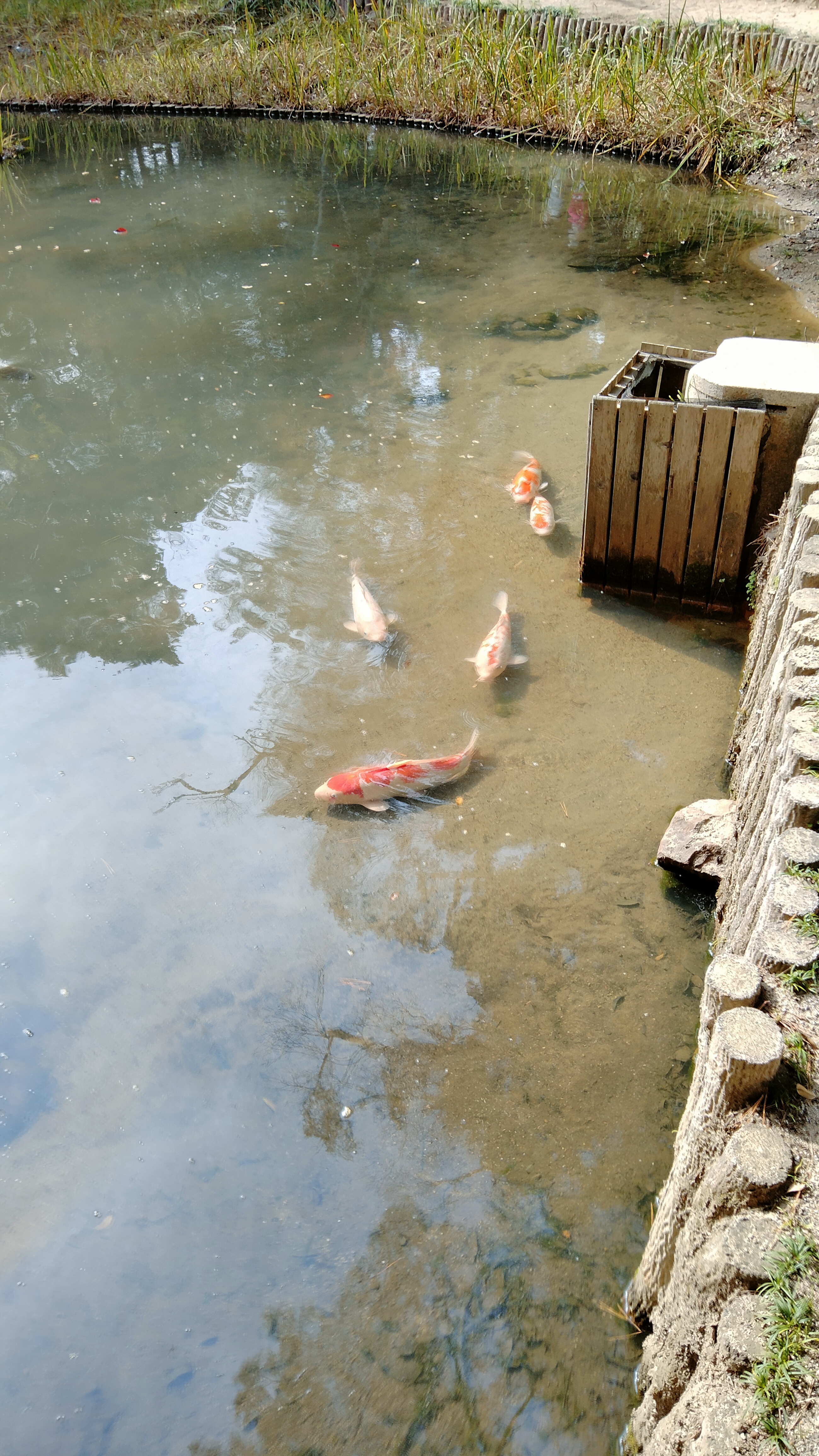 池の端に立つと鯉がスイスイ集まってくるんですが、なんのこたない餌をもらえると思ってるんですよね。