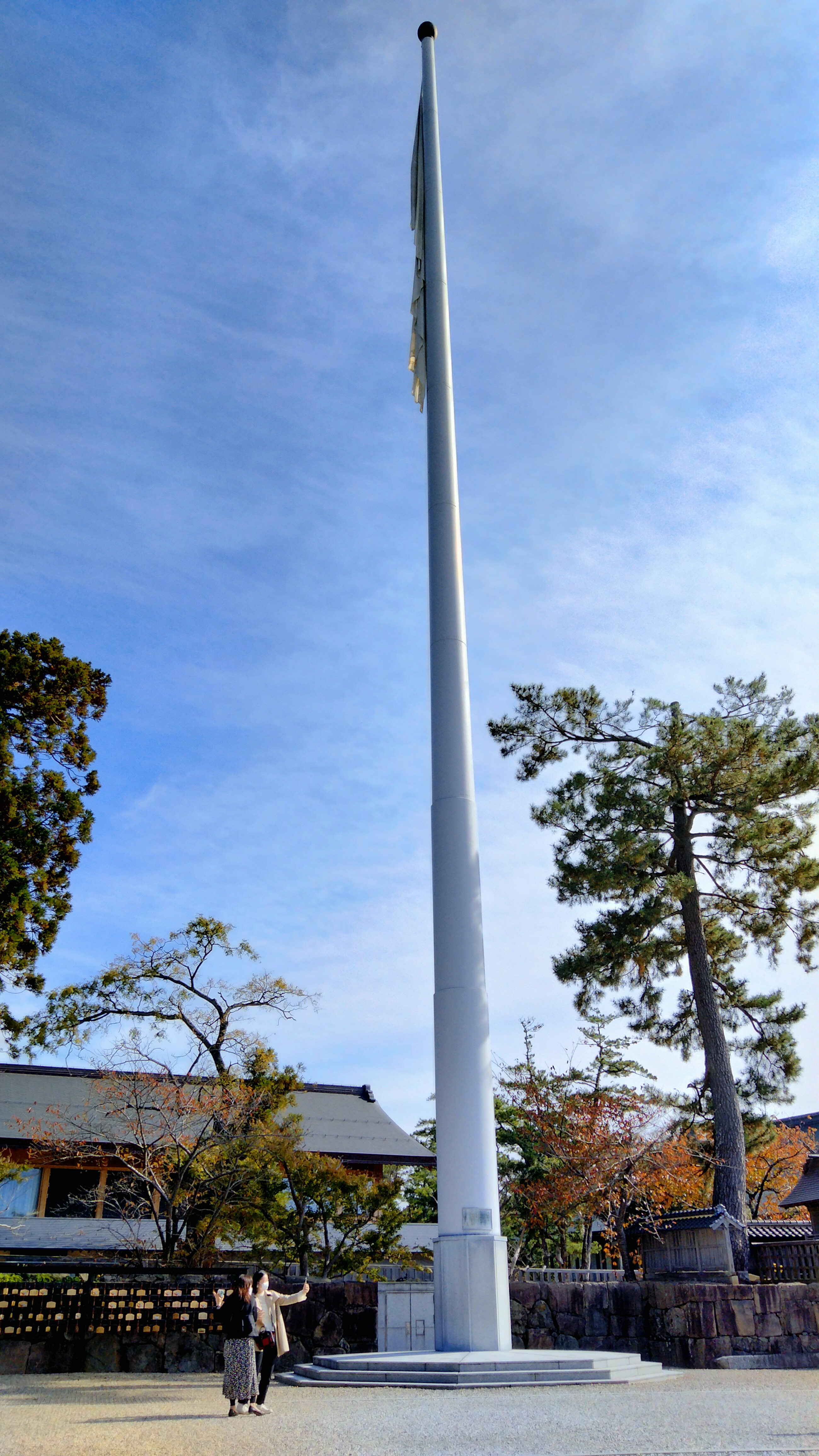 「神楽殿前庭には高さ47メートルの国旗掲揚塔が聳え立ち、揚げられる国旗は75畳(タテ8.7メートル・ヨコ13.6メートル)の大きさです。」