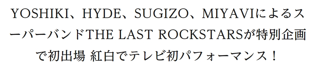 ⚡NHKプラスではフルで配信中https://t.co/lwrvn7DntP#THELASTROCKSTARS #TLRS #YOSHIKI #HYDE #SUGIZO #MIYAVI #NHK紅白 #みんなでシェア pic.twitter.com/Bh3hkxZX90