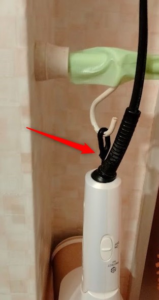 こんな風に固定しなくても、動かないフックがあるから買い替えようと提案したところ、よく見るとそもそもドライヤーのフックが半分千切れそうになっているのに気がつきました。